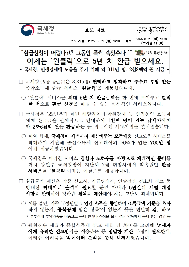 국세청이 2025년 3월 31일부터 시행한 ‘원클릭 환급 서비스’는