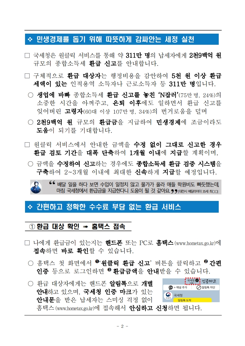 국세청 ‘원클릭 환급서비스’는 국민의 시간과 비용을 절약하고,