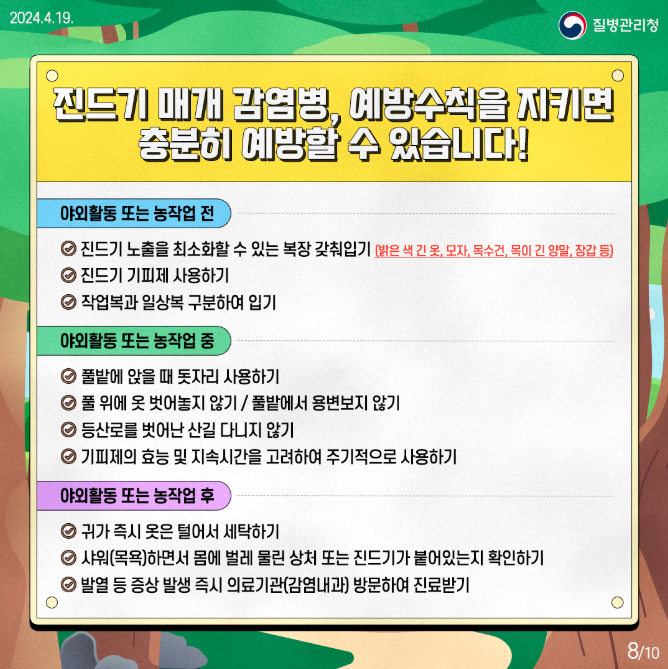 따라서 진드기에 물리지 않도록 사전 예방수칙을 철저히 지키는 것이 무엇보다 중요합니다.