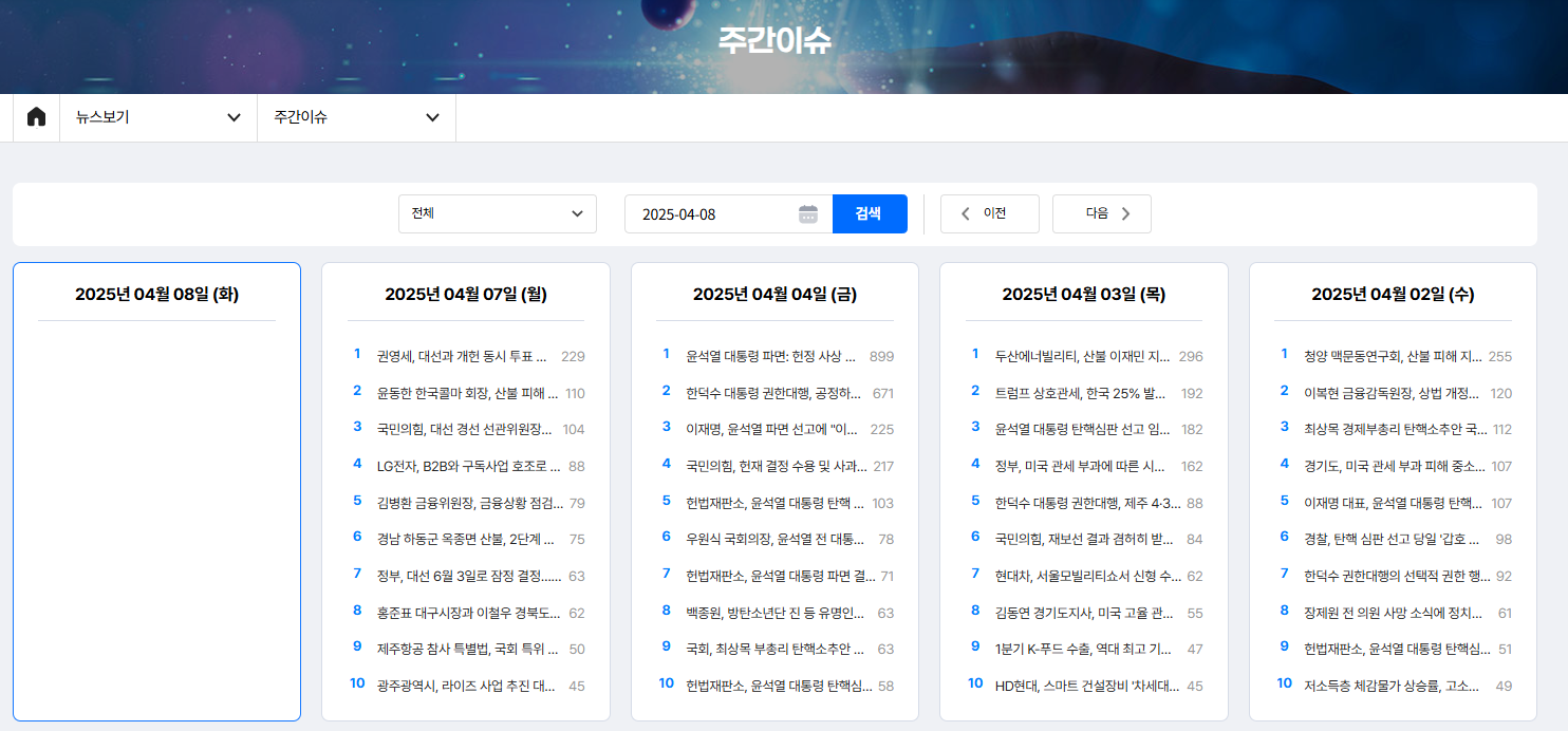 📅 주간이슈 – 날짜별, 분야별 이슈 랭킹 확인