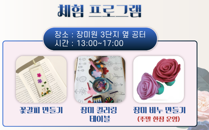 매일 오후 1시~5시, 장미원 3단지 옆 공터에서는 다양한 체험 부스가 운영됩니다: