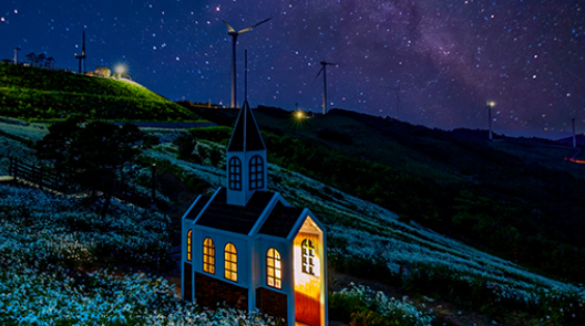 - 풍경 특징: 축구장 6개 크기의 푸른 고원 + 능선을 따라 설치된 대형 풍력발전기 + 계절마다 다른 꽃 군락