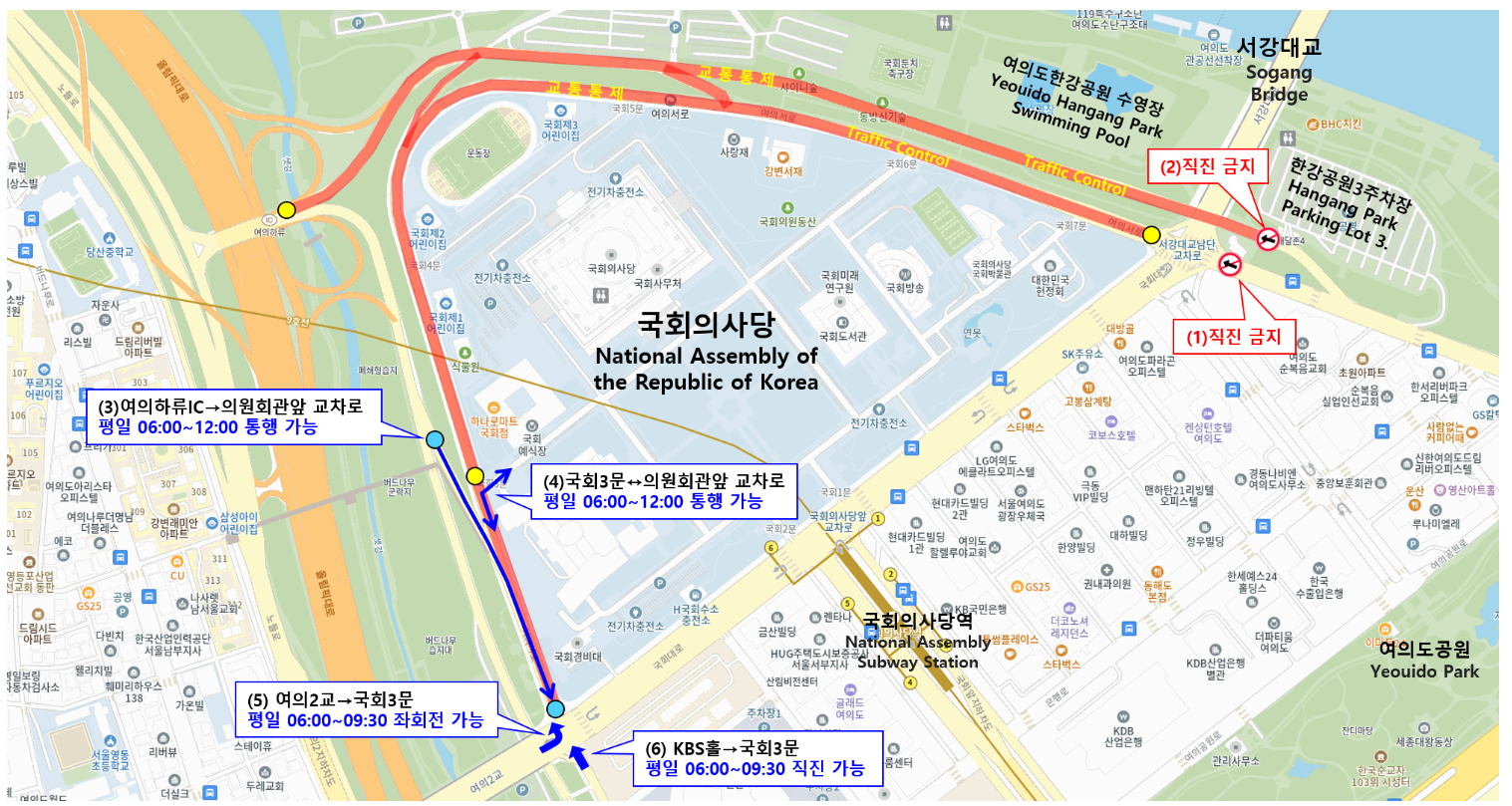- 여의2교 → 국회3문: 평일 06:00~09:30 좌회전만 가능