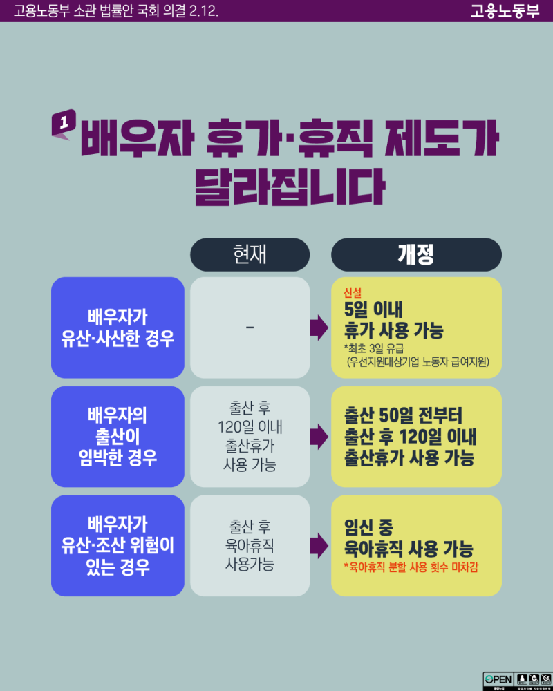 배우자 유산·사산 휴가 신설: 배우자가 유산 또는 사산한 경우, 남편도 마음을 추스르고 배우자를 돌볼 수 있도록 5일 이내(최초 3일 유급)의 휴가가 신설되었습니다.